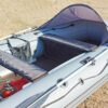 Носовой тент для надувных ПВХ-лодок. Тент изготавливается из непромокаемых текстильных материалов и предназначен для защиты от ветра, брызг и мошкары пассажиров лодки. Тент легко устанавливается на надутую лодку с помощью тонкой металлической составной трубы и системы крючков и пряжек для точной натяжки тента. Тент носовой на лодки «Пилот»-300,320,330,360.