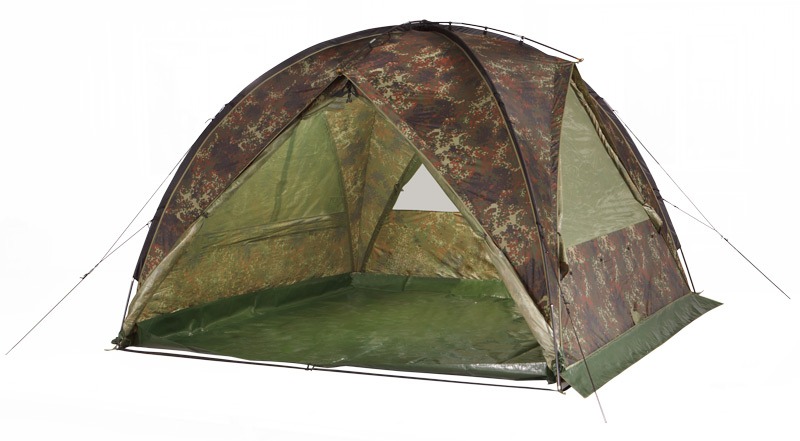 Устойчивый даже без ветровых оттяжек купол-шатер используется для организации кухни-столовой или склада. При фиксации пола в виде короба палатка может использоваться для ночевки до пяти человек.